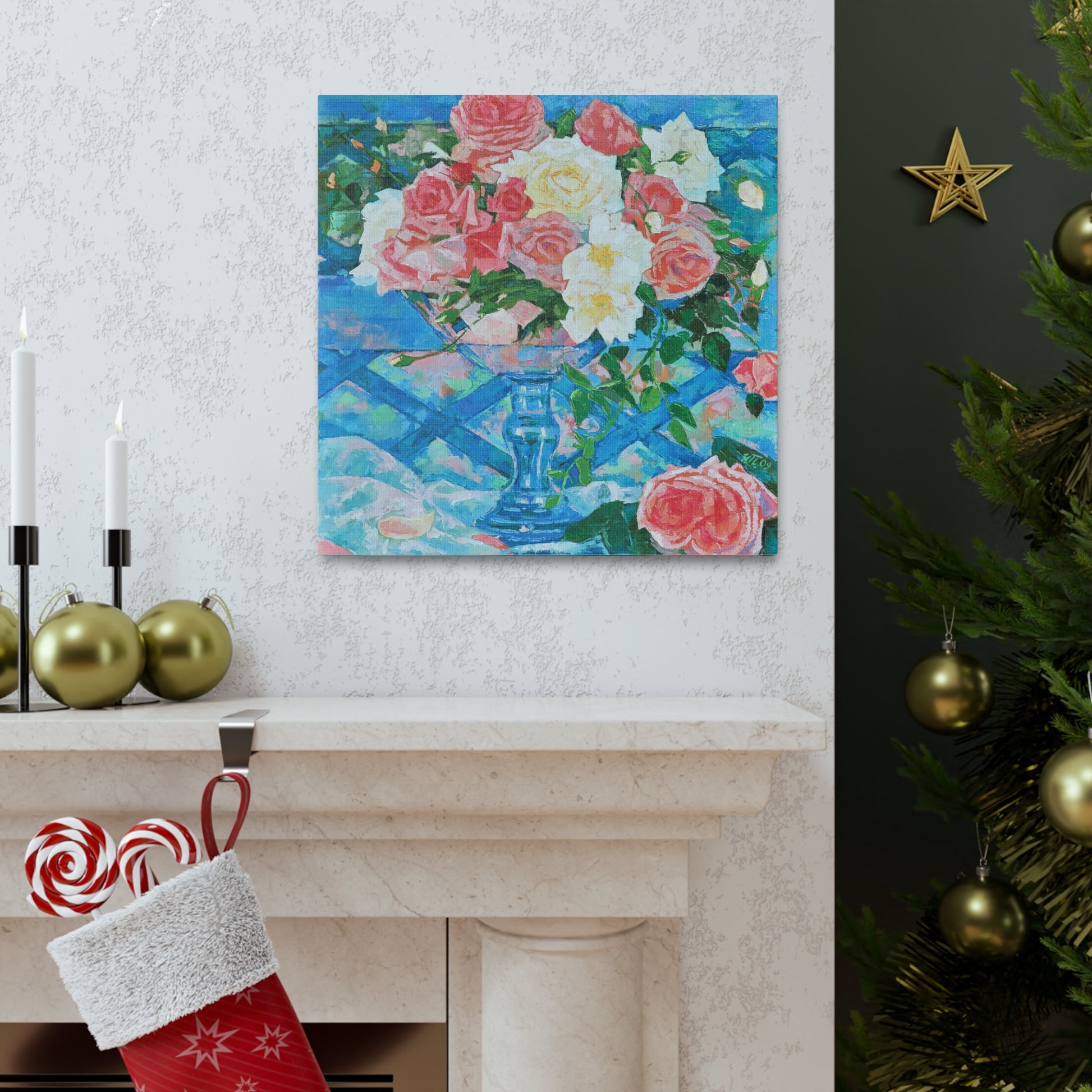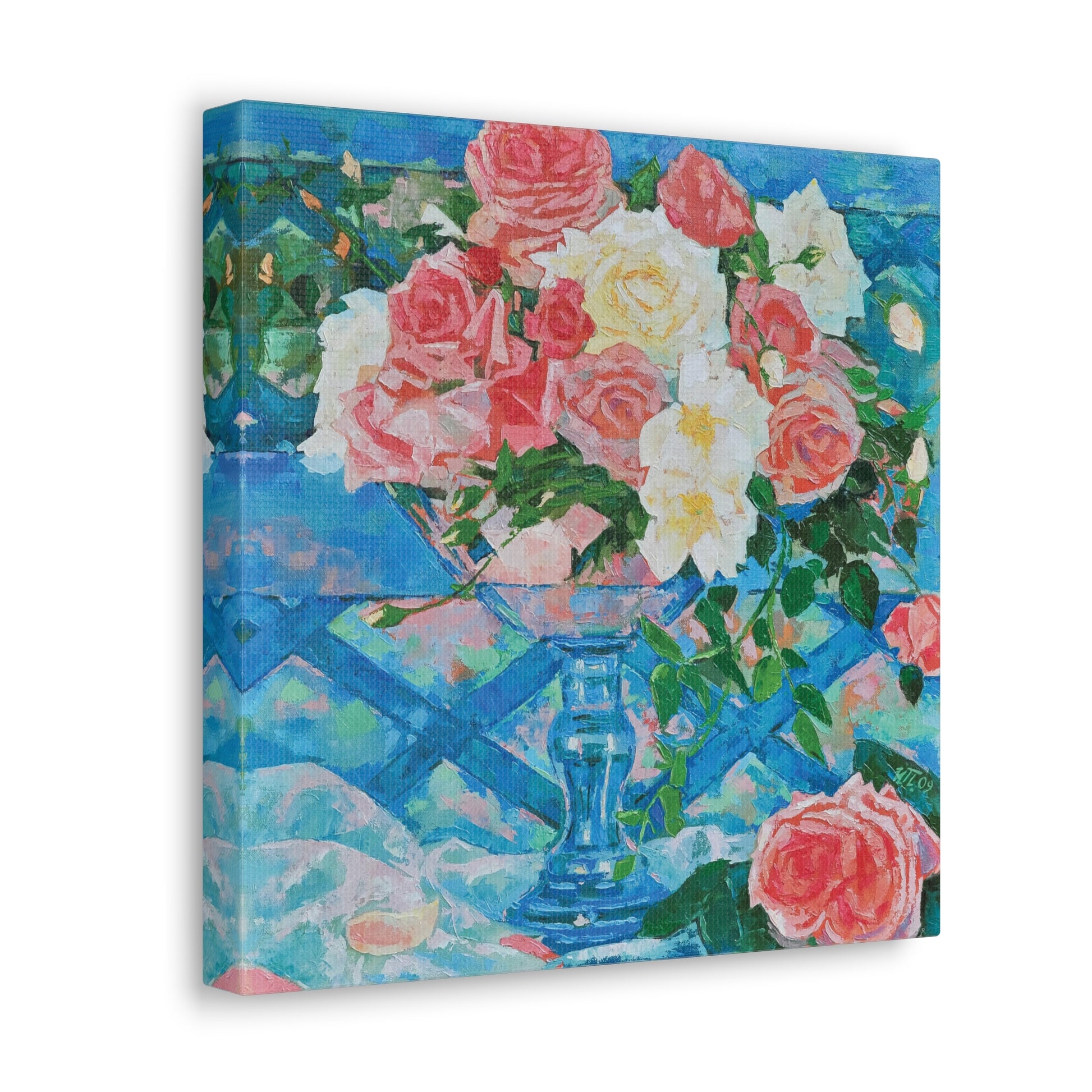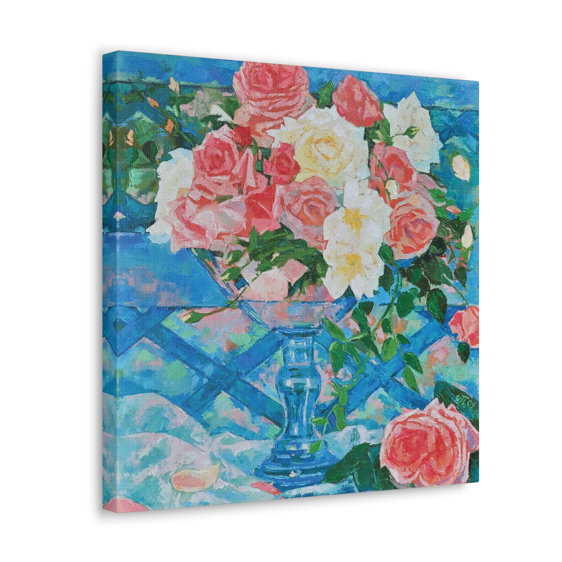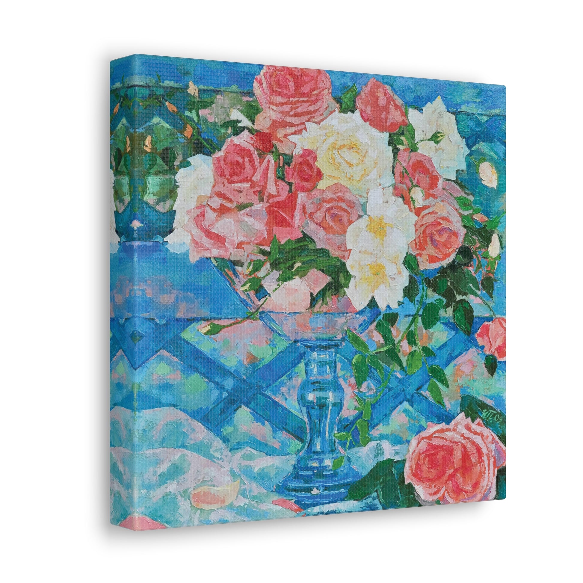 Elevate your home or office with this gorgeous floral canvas print of pink and cream white roses! The artwork features a gorgeous bouquet or rose flowers in a blue glass vase, on a blue background showing a grid pattern tablecloth. The delicate, calm and soft colors make it a great decor piece for almost any interior. A detailed oil painting reproduction, this art print is sure to give any space a more lively and sophisticated look.