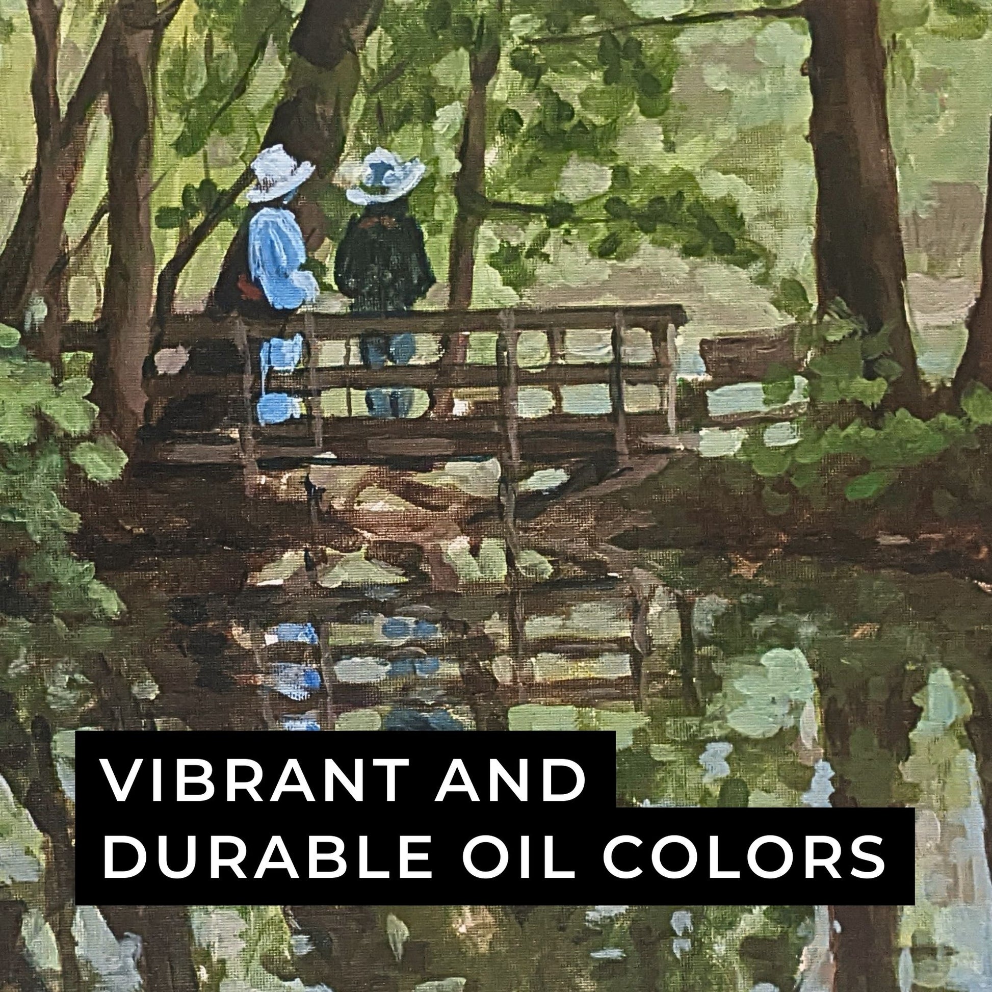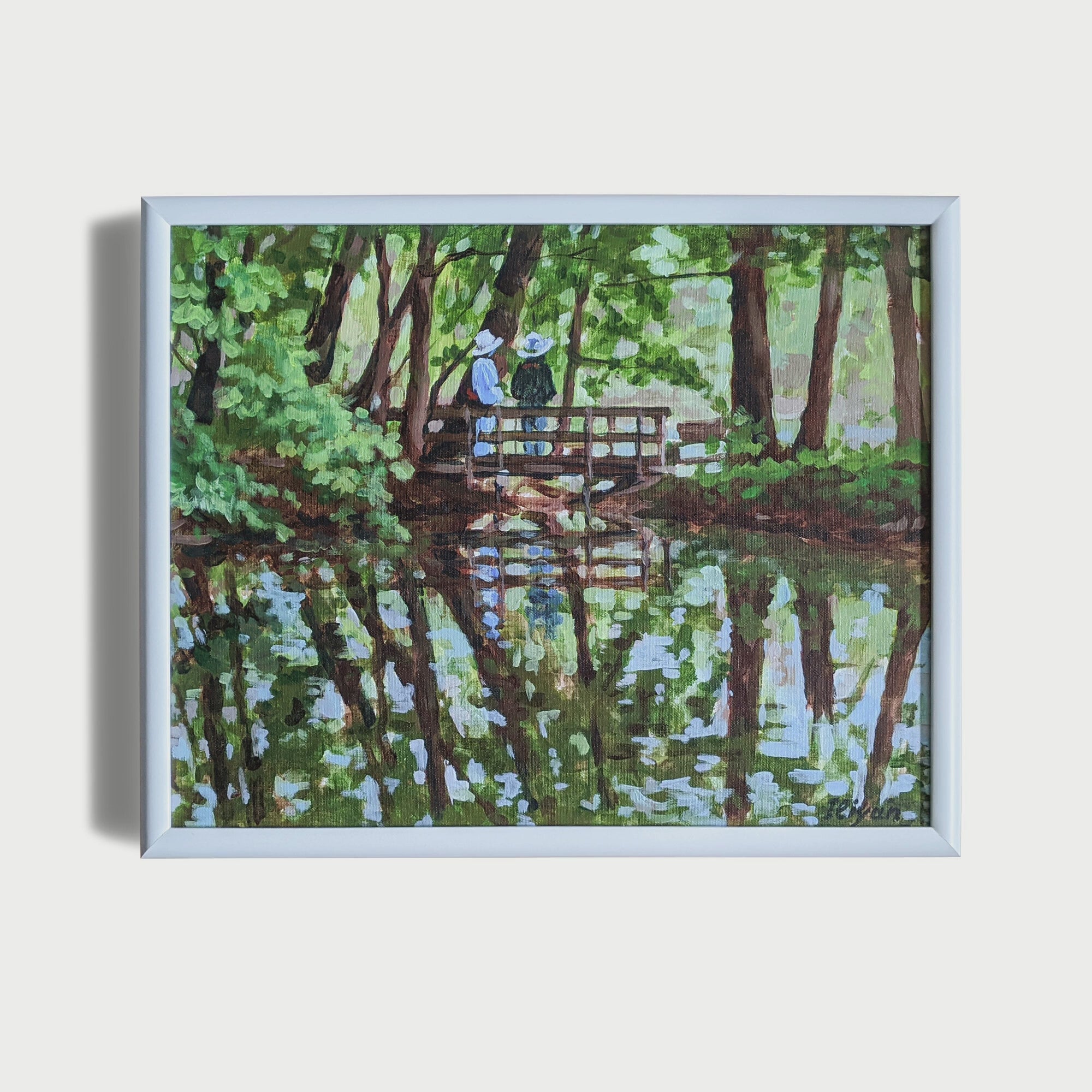 I Like Monet is a vintage oil painting of two people standing on a small wooden bridge above a stream, surrounded by greenery. The calm neutral green colors make this artwork a great decor piece for almost any interior. A detailed oil painting reproduction, this art print is sure to elevate any space and give it more lively and sophisticated look.