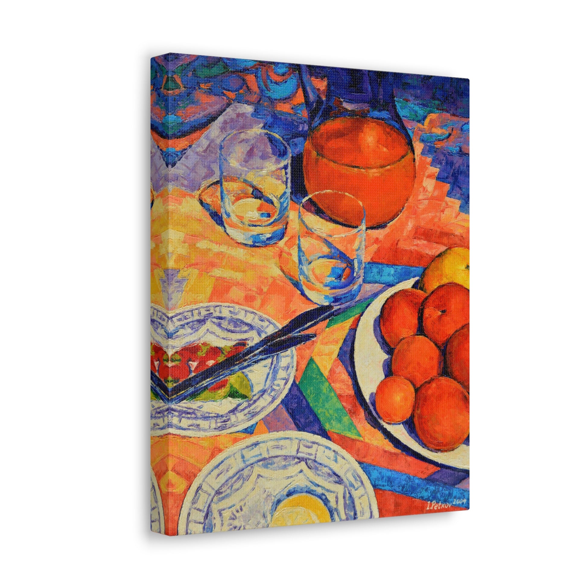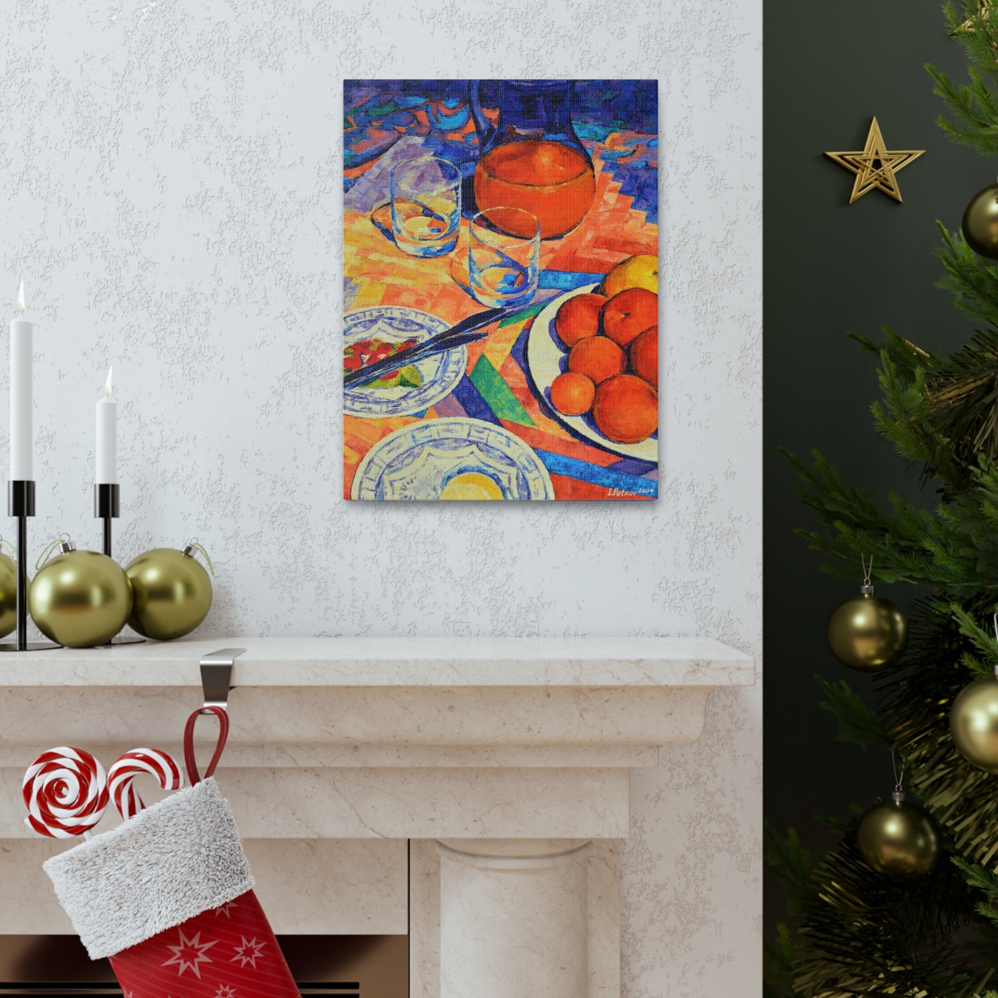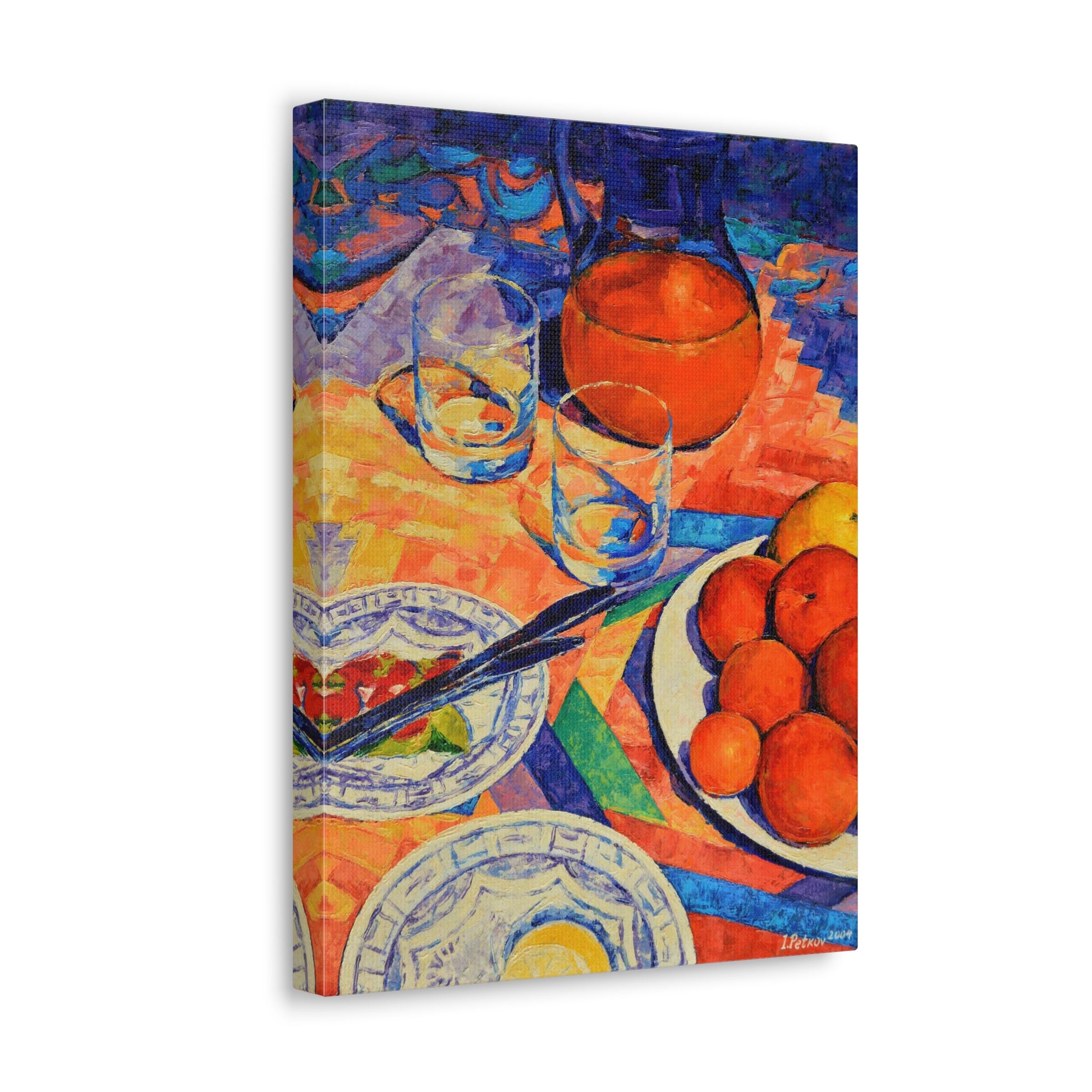 Elevate your home or office with this vibrant still life canvas print! The artwork features a still life of a plate of oranges, a blue glass carafe, plates and glasses on an orange and blue tablecloth. It includes bright orange red colors and a deep yet vibrant blue. The joyful colors make it a great decor piece for almost any interior. A detailed oil painting reproduction, this art print is sure to give any space a more lively and sophisticated look.