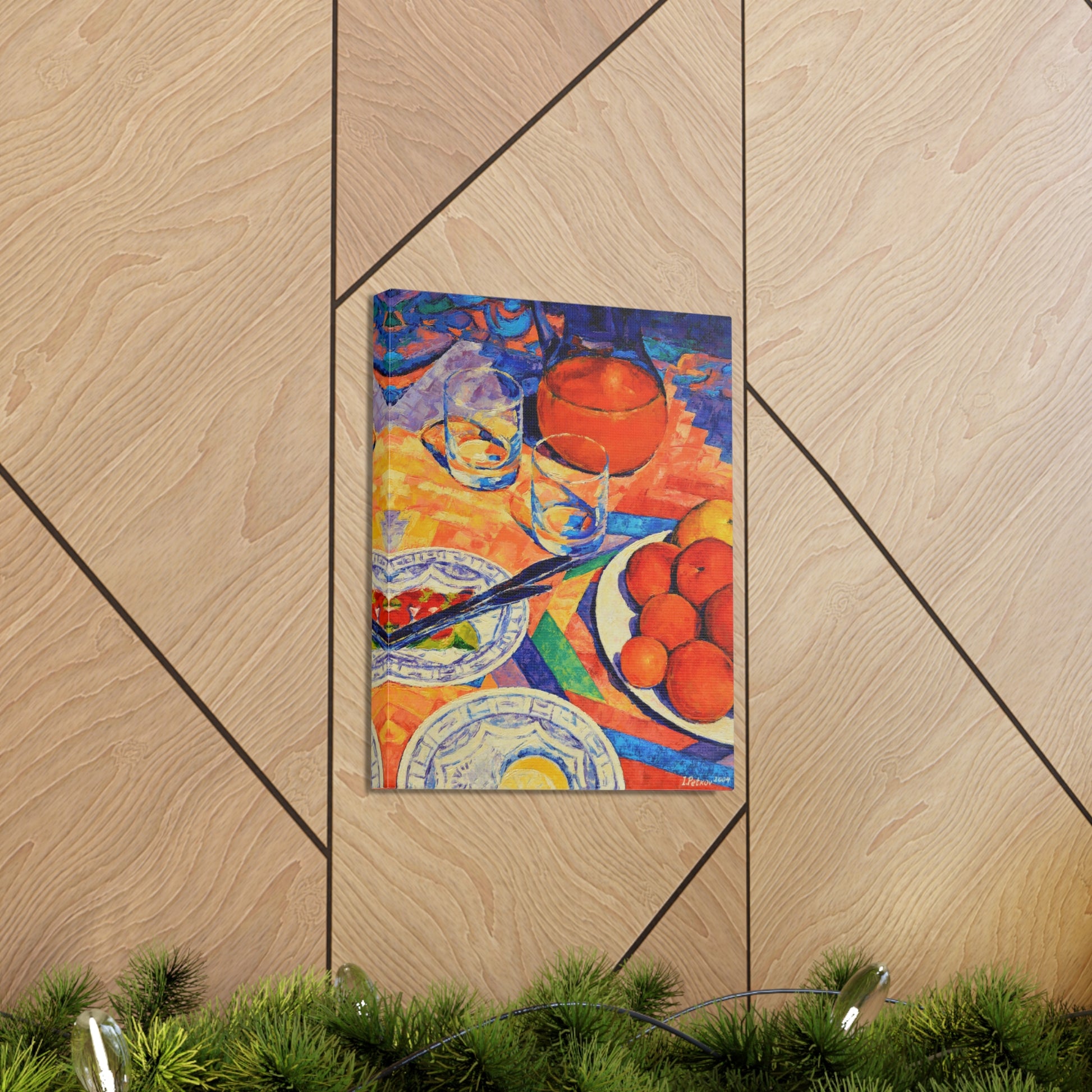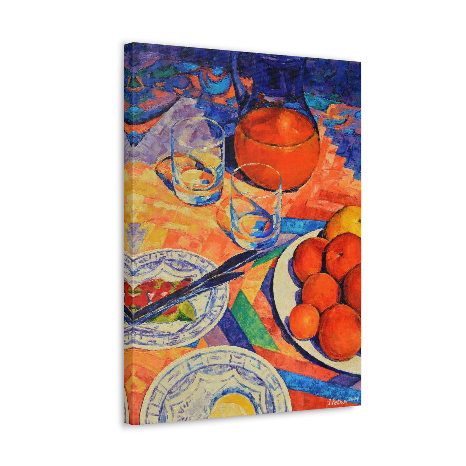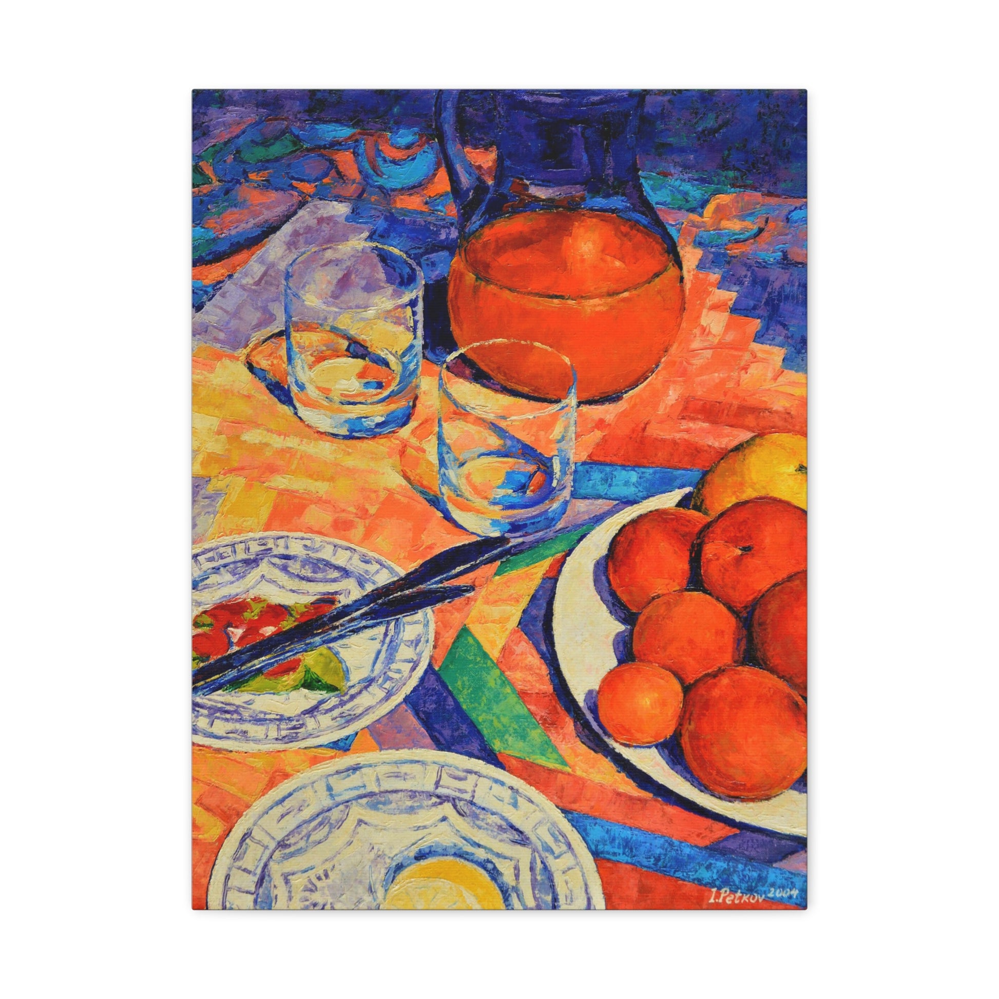 Elevate your home or office with this vibrant still life canvas print! The artwork features a still life of a plate of oranges, a blue glass carafe, plates and glasses on an orange and blue tablecloth. It includes bright orange red colors and a deep yet vibrant blue. The joyful colors make it a great decor piece for almost any interior. A detailed oil painting reproduction, this art print is sure to give any space a more lively and sophisticated look.