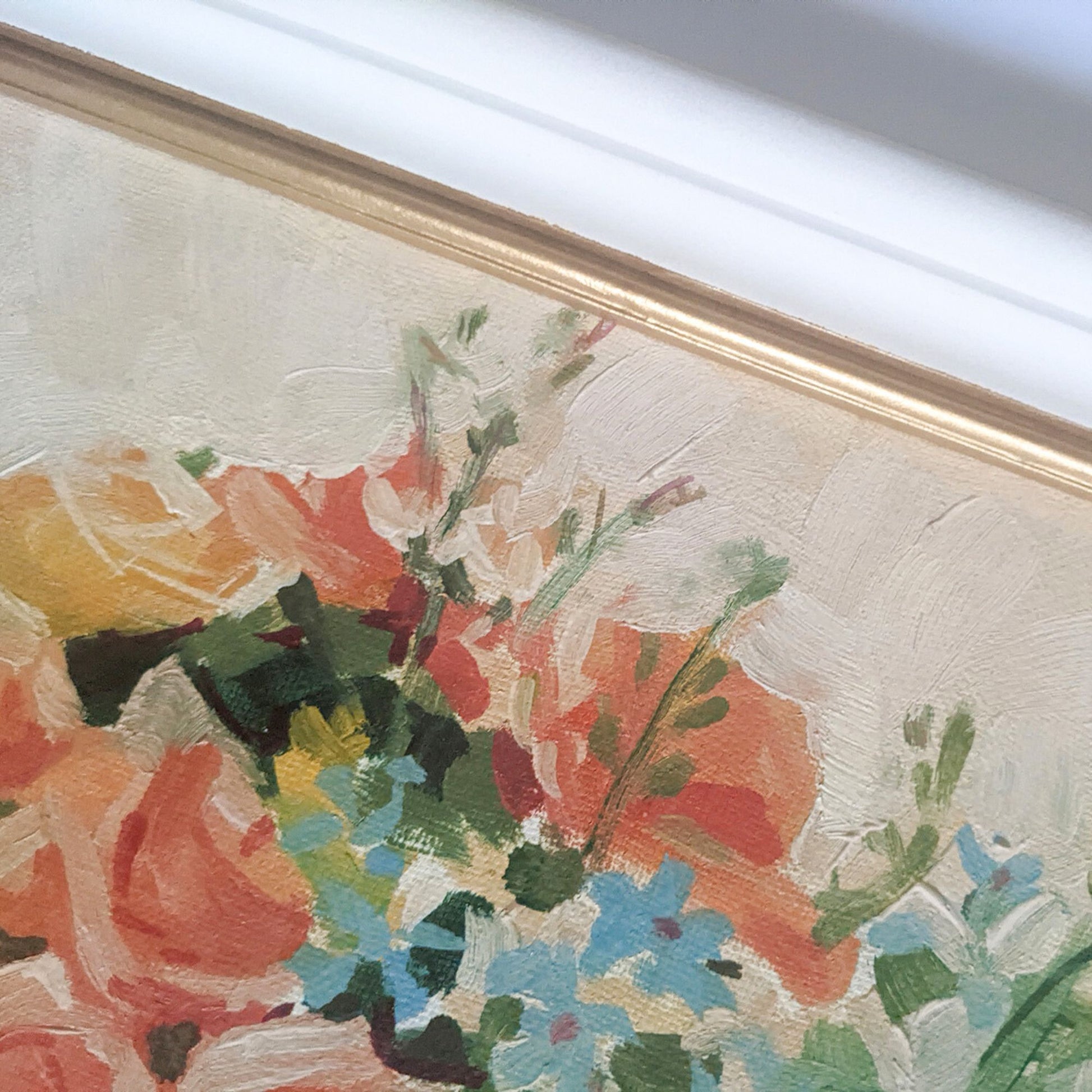 Hand-painted by the artist, this one-of-a-kind original oil painting comes as a stretched canvas and is fully framed and ready to hang. The white frame with a gold accent was custom designed and handmade by the artist specifically for this artwork, making the frame an integral part of the finished piece rather than an afterthought.