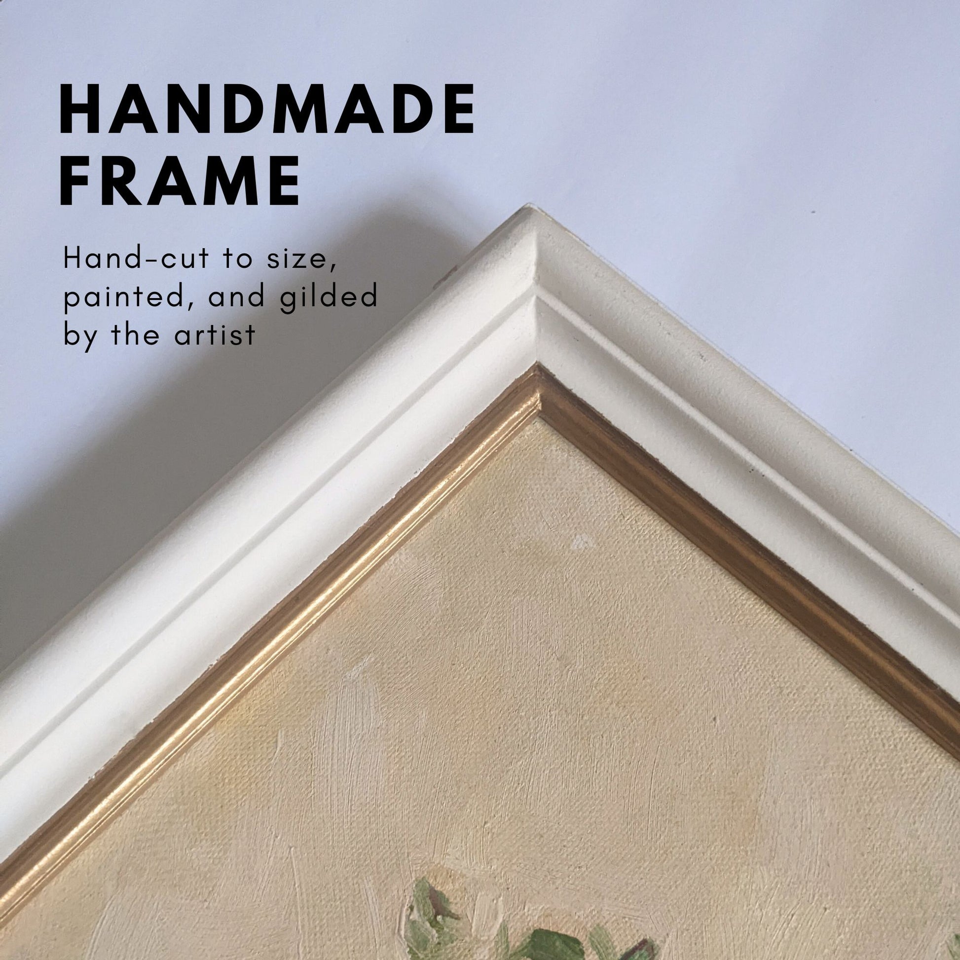 • Custom handmade frame – white frame with gold accent, made by the artist