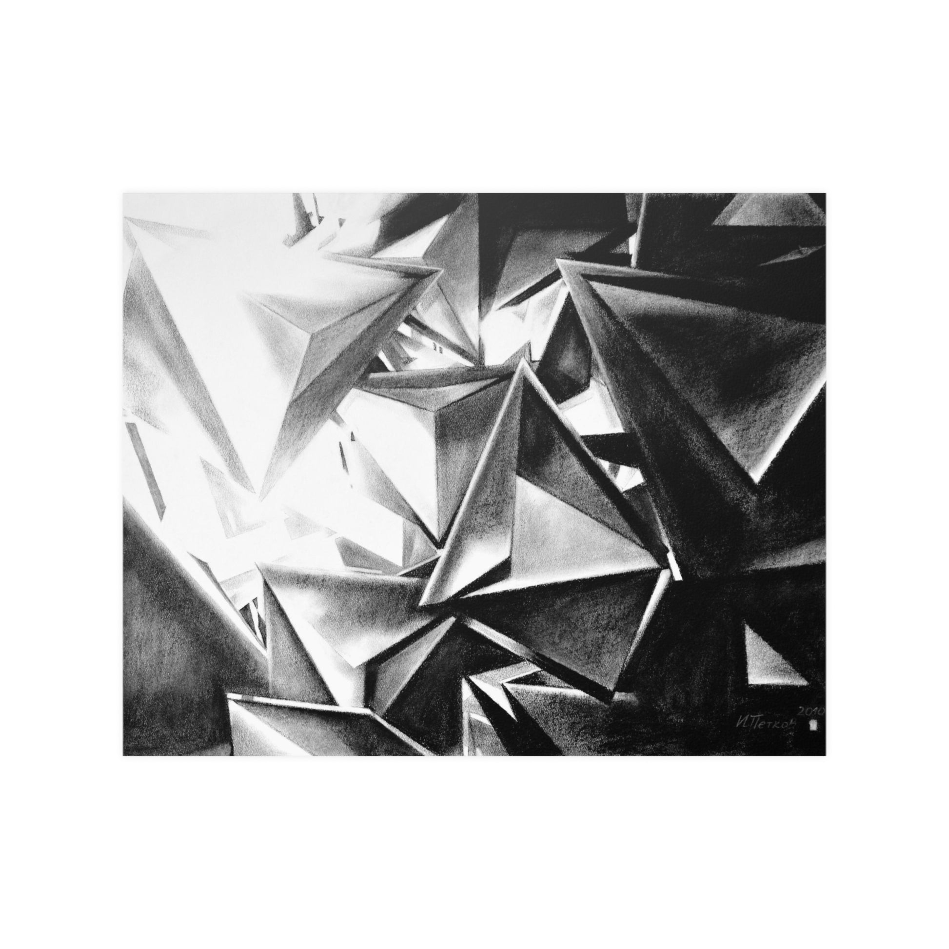 The original artwork, Structure Invasion, is a black and white pastel drawing featuring triangle shapes and pyramid-like clusters in different shades of light and dark. A work of abstract art, Structure Invasion makes a great accent piece in any modern interior, especially those with a minimalist, glam, or industrial aesthetic. Great for office spaces and home interiors where you need just the right amount of visual detail minus overwhelming color.