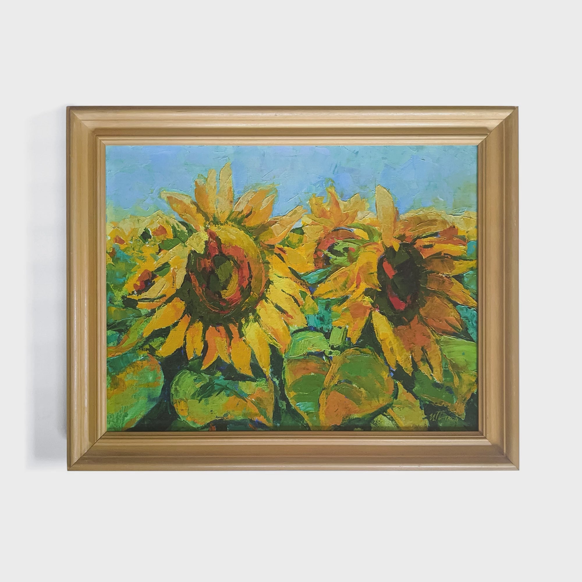 Sunflowers II is a vintage oil painting of bright yellow sunflowers in a field, against a bright blue sky. The vibrant colors evoke feelings of joy and make this artwork a great décor piece for almost any interior. It is sure to elevate any space and give it more lively and sophisticated look.