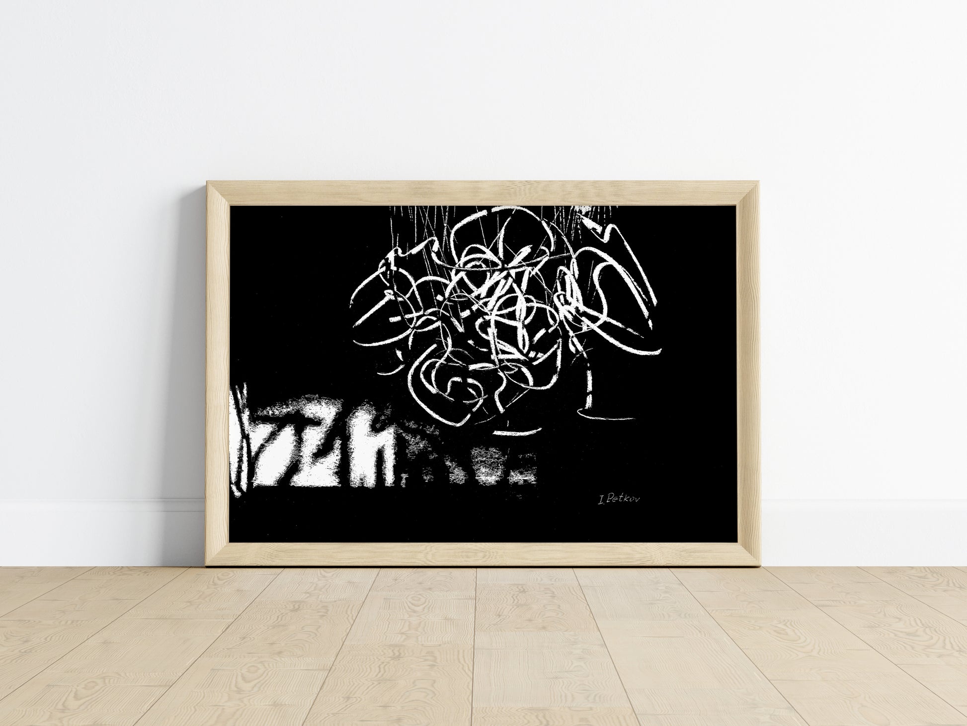 The original artwork, The Thing, is a black and white pastel drawing featuring abstract white elements on a black background. A work of abstract art, The Thing makes a great accent piece in any modern interior, especially those with a minimalist, glam, or industrial aesthetic. Great for office spaces and home interiors where you need just the right amount of visual detail minus overwhelming color.